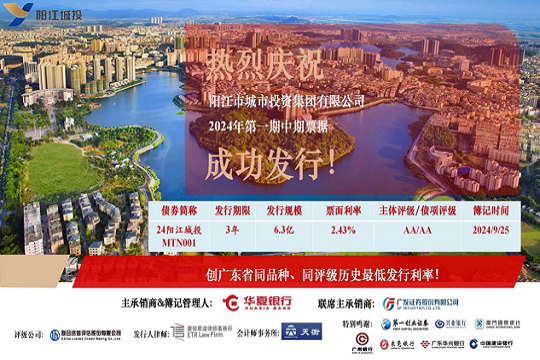 2024年9月26日,市城投集團在中國銀行間交易商協會成功發行“陽江市城市投資集團有限公司2024年第一期中期票據”。本期債券發行規模為6.3億元,期限為3年,票面利率2.43%,全場倍數超過2.52倍。本期債券創下了廣東省同...